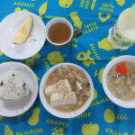 <給食> 御飯 野菜コーンスープ(チンゲン菜) 鶏肉のマーマレード煮 蒸し野菜のサラダ バナナ <おやつ> 牛乳 おやつ・チャーハン(ツナ・ひじき)