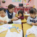 ビニール袋にシールを貼って凧作りをしました。完成した凧を持って園庭に出ると、走ったり、風に揺れる様子を見ながら伸び伸びと楽しみました。