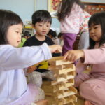 きりん組(2歳児)とカプラで遊びました。年下の子がいると、日頃と表情も変わり、優しい表情になるさくら組の子ども達がとても可愛いです。