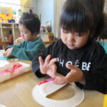 鬼のお面を作りました。千切った折り紙を糊で紙皿に貼っていきます。丁寧に制作できるようになりました。
