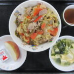 <給食> みそ炒め丼 豆腐のスープ(わかめ) りんご ベビーチーズ たくさんおかわりしてくれました(*^_^*)