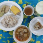 <給食> ハリハリゆかり御飯 豆腐の旨煮 れんこんとちくわの天ぷら バナナ <おやつ> 牛乳 カルシウムおにぎり(昆布・ごま)