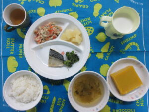 12月12日(木) 給食・おやつ献立 公開済み: 2024年12月12日更新: 2024年12月13日作成者: hayamanookaカテゴリー: 端山の丘こども園給食 〈給食〉 ・ごはん ・すまし汁(白菜・えのき) ・さばの塩焼き ・添えブロッコリー ・卯の花 ・パイン缶 〈おやつ〉 ・牛乳 ・かぼちゃかん 関連記事 2月9日(木) 給食・おやつ献立 ・さつま芋ごはん ・みそ汁(切り干し大根・玉ねぎ) ・八宝菜 ・かぶときゅうりの酢のもの 〈おやつ〉 ・牛乳 ・おやつ小魚 ・フライドポテト 公開済み: 2023年2月9日更新: 2023年2月13日作成者: hayamanookaカテゴリー: 端山の丘こども園給食 6月7日(水) 給食・おやつ献立 〈給食〉 ・ごはん ・みそ汁(かぼちゃ・チンゲン菜) ・豚肉と玉ねぎのソテー ・ベイクド里芋 〈おやつ〉 ・牛乳 ・にんじんおやき 公開済み: 2023年6月7日更新: 2023年6月8日作成者: hayamanookaカテゴリー: 端山の丘こども園給食 10月2日(水) 給食・おやつ献立 〈給食〉 ・ごはん ・中華スープ(じゃがいも・チンゲン菜) ・厚揚げの炒め物 ・きゅうりとしらすの酢の物 ・りんご 〈おやつ〉 ・牛乳 ・おにぎり(さけ・ごま) 公開済み: 2024年10月2日更新: 2024年10月17日作成者: hayamanookaカテゴリー: 端山の丘こども園給食