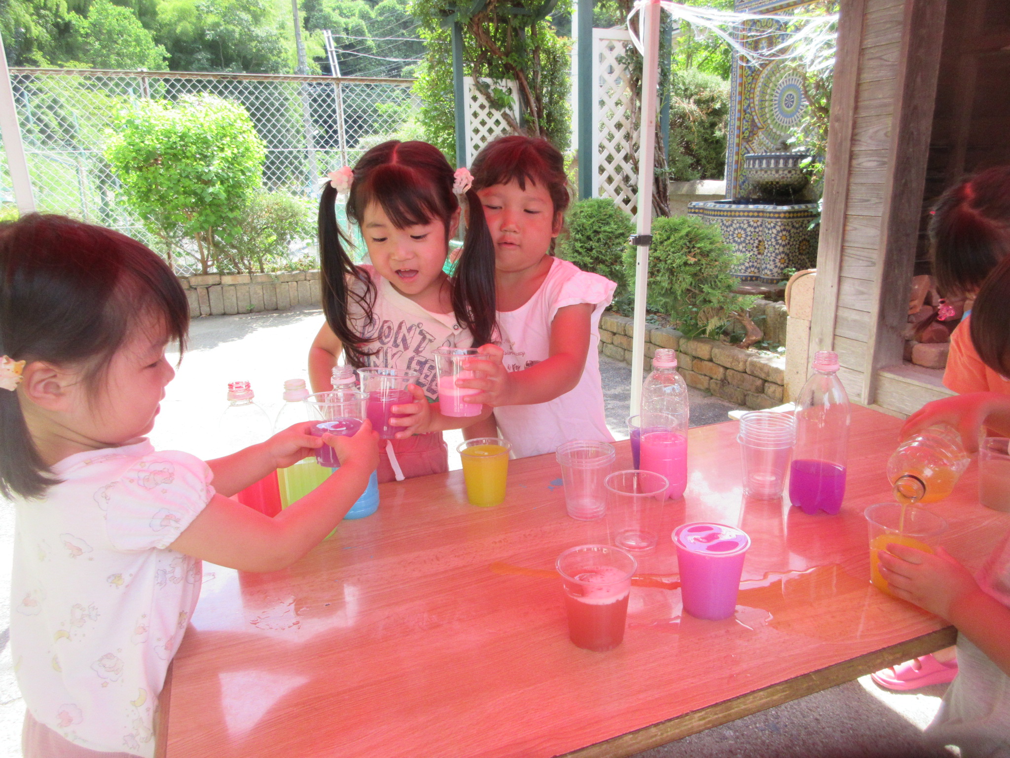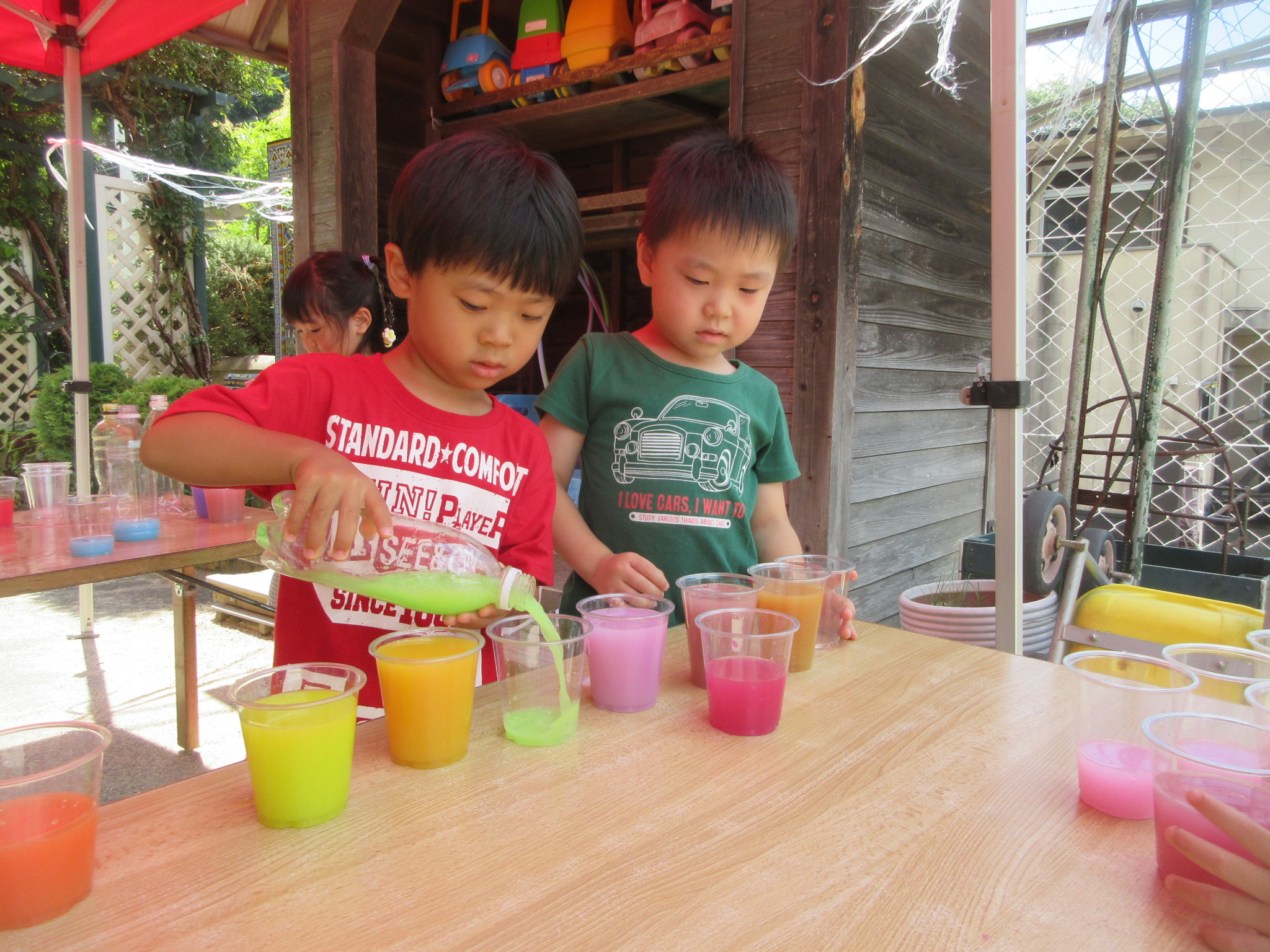 ジュース屋さんごっこ🍹(たんぽぽ、3歳児) 公開済み: 2025年8月8日更新: 2025年8月26日作成者: hayamanookaカテゴリー: 端山の丘こども園ブログ 「いちごジュースが出来たよ!」「いらっしゃいませ~!どのジュースがいいですか?」など、色とりどりのジュースを作って、お友達と「かんぱーい!!」と、色水遊びを楽しみました。 関連記事 いい天気でよかったなぁ(ゆり、5歳児)) 公開済み: 2022年11月7日更新: 2022年11月7日作成者: hayamanookaカテゴリー: 端山の丘こども園ブログ ぽんぽんぽん♪(うさぎ、0歳児、1歳児) 公開済み: 2022年7月11日更新: 2022年7月15日作成者: hayamanookaカテゴリー: 端山の丘こども園ブログ 成長したね!(たんぽぽ、3歳児) 園庭遊び。ジャングルジムに登って「おーい!」高いところまで登れるようになり、自信満々に呼んでいました。 公開済み: 2025年1月29日更新: 2025年1月29日作成者: hayamanookaカテゴリー: 端山の丘こども園ブログ