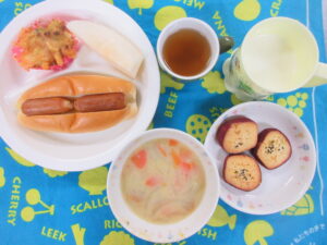 10月22日(水) 給食・おやつ献立 公開済み: 2025年10月22日更新: 2025年10月24日作成者: hayamanookaカテゴリー: 端山の丘こども園給食 <給食> ホットドッグ 野菜コーンスープ かぼちゃのグラタン なし <おやつ> 牛乳 おさつクッキー 今日はお誕生日会でした。 おやつのクッキーはさつまいもに見立てて作りました(o^―^o) クッキー生地にもさつまいもが入っています! 関連記事 6月9日給食 おこわ 中華スープ(じゃがいも・わかめ) 豆腐のコーンみそ焼き きゅうりのピクルス バナナヨーグルト 公開済み: 2020年6月9日更新: 2020年6月9日作成者: hayamanookaカテゴリー: 端山の丘こども園給食 4月11日(金) 給食・おやつ献立 <給食> 御飯 みそ汁(じゃがいも・わかめ) 豚肉のすき焼き風煮物(豆腐) 大根のごま酢和え りんご <おやつ> 牛乳 にんじんおやき 公開済み: 2025年4月11日更新: 2025年4月14日作成者: hayamanookaカテゴリー: 端山の丘こども園給食 5月14日給食 ごはん すまし汁(じゃがいも・わかめ) 鯖のさっぱり甘酢ソース キャベツのおかか和え バナナヨーグルト 公開済み: 2020年5月15日更新: 2020年5月15日作成者: hayamanookaカテゴリー: 端山の丘こども園給食