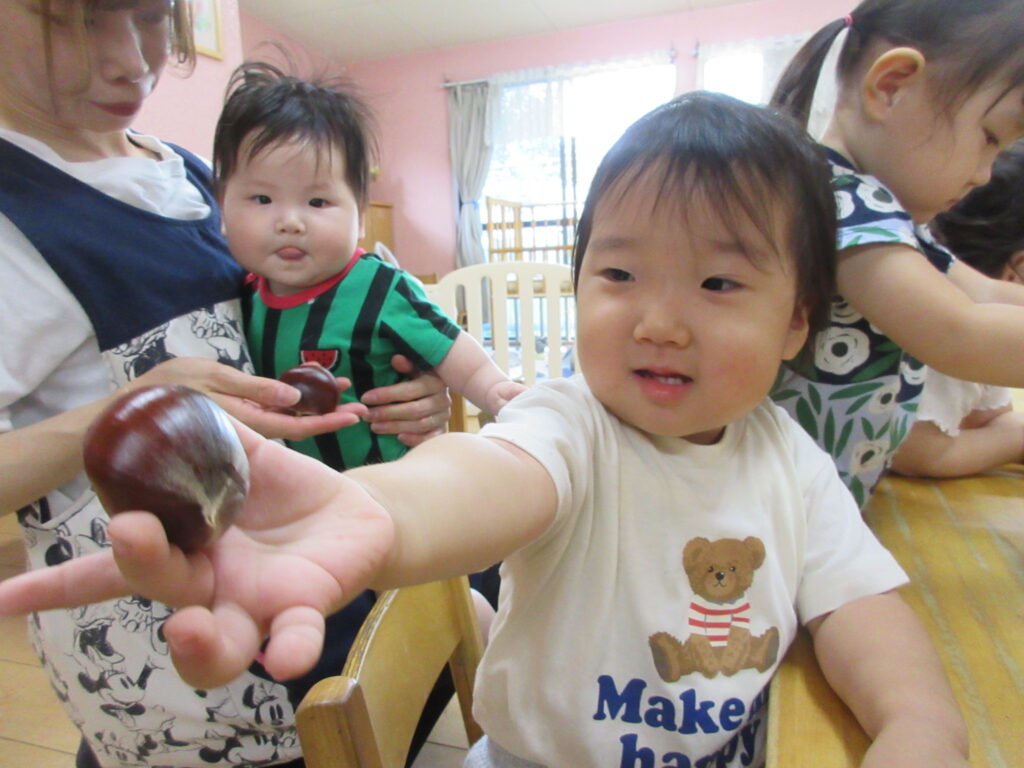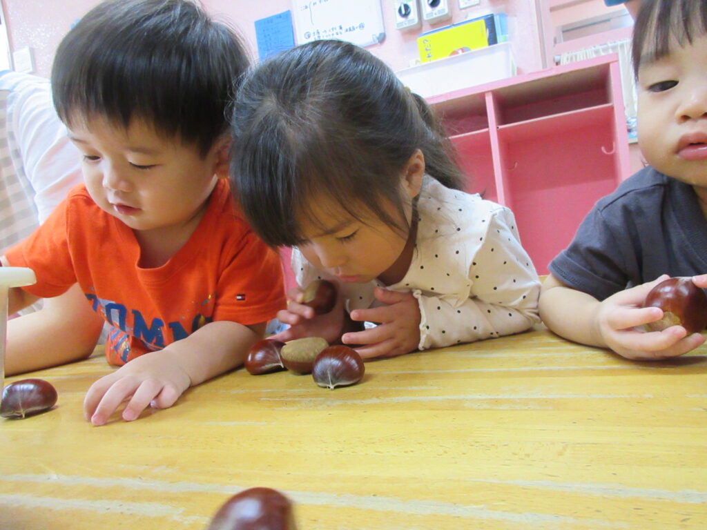 みてみて!栗だよ!(うさぎ0歳児、1歳児) 公開済み: 2025年10月24日更新: 2025年10月24日作成者: hayamanookaカテゴリー: 端山の丘こども園ブログ 秋の味覚に親しむ食育活動として、栗を触ってみました。手のひらでころころ転がしてみたり、匂いを嗅いだりしながら、秋ならではの食べ物に触れる事を楽しむ事が出来ました。 関連記事 色々な電車が間近で見られたね(5歳、ゆり組) 京都鉄道博物館へ行ってきました。 SLに乗り、間近で電車を見て満喫出来た1日でした。 公開済み: 2023年11月10日更新: 2023年11月10日作成者: hayamanookaカテゴリー: 端山の丘こども園ブログ 僕たちが描いたんだよ!(たんぽぽ、3歳児) 将来、必須になるであろうタブレット操作。園では、子供たちにも身近に感じてもらえるように、iPadを使い楽しめるアプリを取り入れています。KITS「アートポン」は、自分が塗った塗り絵が画面上に出てくるので、大興奮です! 公開済み: 2022年5月31日更新: 2022年5月31日作成者: hayamanookaカテゴリー: 端山の丘こども園ブログ 思い思いの秋?(きりん、2歳児) 公開済み: 2022年11月14日更新: 2022年11月14日作成者: hayamanookaカテゴリー: 未分類, 端山の丘こども園ブログ
