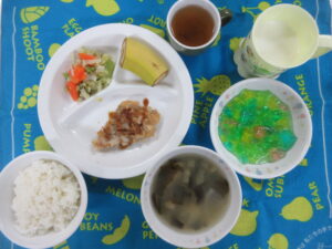 11月4日(火) 給食・おやつ献立 公開済み: 2025年11月4日更新: 2025年11月8日作成者: hayamanookaカテゴリー: 端山の丘こども園給食 <給食> 御飯 みそ汁(いも・なす) たらのフライ 蒸し野菜のサラダ バナナ <おやつ> 牛乳 カラフルゼリー(寒天) 関連記事 7月25日(月) 給食・おやつ献立 ・ドライカレーライス(夏) ・コーンスープ ・切干大根としらす干しサ干し ・すいか 〈おやつ〉 ・牛乳 ・凍り豆腐のきな粉トースト 公開済み: 2022年7月25日更新: 2022年8月9日作成者: hayamanookaカテゴリー: 端山の丘こども園給食 2月16日(木) 給食・おやつ献立 ・にんじんご飯 ・みそ汁(かぼちゃ・ねぎ) ・鶏肉の甘酢煮 ・卯の花 〈おやつ〉 ・牛乳 ・チャーハン(しらす・ひじき) 公開済み: 2023年2月16日更新: 2023年3月4日作成者: hayamanookaカテゴリー: 端山の丘こども園給食 12月10日(土) 給食献立 〈給食〉 ・あんかけうどん ・ベビーチーズ ・みかん 公開済み: 2022年12月10日更新: 2022年12月15日作成者: hayamanookaカテゴリー: 端山の丘こども園給食