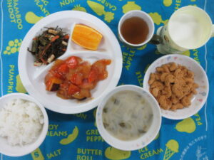 11月13日(木) 給食・おやつ献立 公開済み: 2025年11月13日更新: 2025年11月19日作成者: hayamanookaカテゴリー: 端山の丘こども園給食 <給食> 御飯 豆乳汁(だいこん) 赤魚とさつま芋のケチャップ煮 昆布の煮物 オレンジ <おやつ> 牛乳 マカロニきなこ 関連記事 9月26日(金) 給食・おやつ献立 <給食> 御飯 コーンスープ(とうがん) さばの竜田揚げ キャベツの磯和え(青菜・にんじん) オレンジ キャベツの磯和えのキャベツをゆり組さんがちぎるお手伝いをしてくれました☆ <おやつ> 牛乳 […] 公開済み: 2025年9月26日更新: 2025年9月26日作成者: hayamanookaカテゴリー: 端山の丘こども園給食 11月1日(水) おやつ献立 今日はお弁当日でした♪ 〈おやつ〉 ・さつま芋のりんごジュース煮 公開済み: 2023年11月1日更新: 2023年11月10日作成者: hayamanookaカテゴリー: 端山の丘こども園給食 8月19日(火) 給食・おやつ献立 <給食> 御飯 豆腐スープ ピーマンの細切り炒め ベイクドじゃが みかんのサラダ <おやつ> 牛乳 米粉のバナナパン(大豆粉) 公開済み: 2025年8月19日更新: 2025年8月22日作成者: hayamanookaカテゴリー: 端山の丘こども園給食