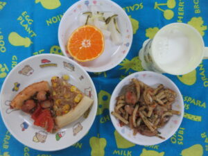 11月18日(火) 給食・おやつ献立 公開済み: 2025年11月18日更新: 2025年11月19日作成者: hayamanookaカテゴリー: 端山の丘こども園給食 <給食> お弁当日(うさぎ・きりん・たんぽぽ) お楽しみクッキング(さくら・ゆり) 大根ときゅうりのピクルス みかん さくら組は「コーンツナマヨピザ」と「野菜たっぷりピザ」の2種類作りました☆ ゆり組は「BBQ]をして、トッポギ・ウインナー・ピーマン・キャベツ・ミニトマトを串に刺して食べました♪ どちらのクラスもとっても喜んで食べていました! <おやつ> 牛乳(さくら・ゆり) 焼きうどん 関連記事 6月3日(金) 給食・おやつ献立 ごはん みそ汁(豆腐・あげ) さわらと人参の煮物 アスパラとキャベツのごま和え りんご 〈おやつ〉 牛乳 ひじきチャーハン 公開済み: 2022年6月3日更新: 2022年6月11日作成者: hayamanookaカテゴリー: 端山の丘こども園給食 10月3日給食 あんかけうどん バナナ ベビーチーズ 公開済み: 2020年10月3日更新: 2020年10月3日作成者: hayamanookaカテゴリー: 端山の丘こども園給食 12月18日 給食 焼きそば みかん ベビーチーズ 公開済み: 2021年12月18日更新: 2021年12月18日作成者: hayamanookaカテゴリー: 端山の丘こども園給食