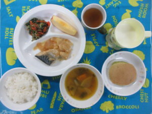 11月20日(木) 献立・おやつ献立 公開済み: 2025年11月20日更新: 2025年11月22日作成者: hayamanookaカテゴリー: 端山の丘こども園給食 <献立> 御飯 さばと玉ねぎのみそ煮 キャベツとほうれん草の磯和え りんご <おやつ> 牛乳 抹茶ホットケーキ 関連記事 11月20日 給食 豚丼 みそ汁(キャベツ、あげ) パイン缶 公開済み: 2021年11月24日更新: 2021年11月24日作成者: hayamanookaカテゴリー: 端山の丘こども園給食 5月13日(月)給食・おやつ献立 <給食> 鶏とひじきの炊き込み御飯 豆腐の旨煮(キャベツ) さつま芋の大豆粉揚げ りんご <おやつ> 牛乳 ホットケーキ 公開済み: 2024年5月13日更新: 2024年5月13日作成者: hayamanookaカテゴリー: 端山の丘こども園給食 3月3日(月) 給食・おやつ献立 今日は、お誕生日会とひな祭りメニューでした🌸 3月生まれのみなさんおめでとうございます! <給食> ひな祭り・ケーキ寿司 すまし汁(菜の花) 鶏肉のマーマレード焼き ゆでブロッコリー いちご <おやつ& […] 公開済み: 2025年3月3日更新: 2025年3月6日作成者: hayamanookaカテゴリー: 端山の丘こども園給食