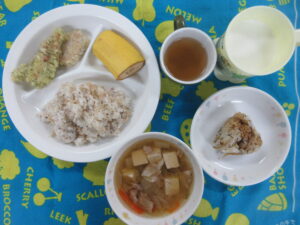 9月20日(水) 給食・おやつ献立 〈給食〉 ・ごはん ・スープ(じゃがいも・しめじ) ・白身魚の包み焼き ・おくらとちくわの海苔和え 〈おやつ〉 ・牛乳 ・米粉蒸しパン 公開済み: 2023年9月20日更新: 2023年10月4日作成者: hayamanookaカテゴリー: 端山の丘こども園給食