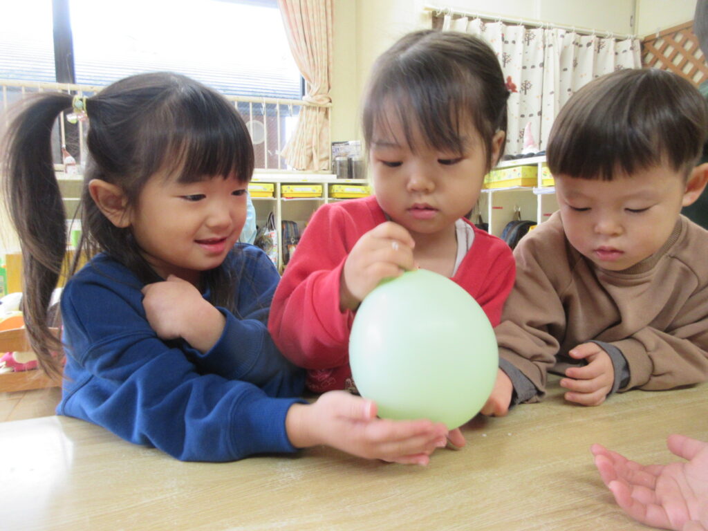 手触りいいね(たんぽぽ、3歳児) 公開済み: 2025年11月27日更新: 2025年11月27日作成者: hayamanookaカテゴリー: 端山の丘こども園ブログ 作品展、共同製作の風船をみんなで膨らませました。中には水溶き片栗粉が入っていて、ぽよんぽよんとしています。 関連記事 練習を積み重ねました(たんぽぽ、3歳児) 9月23日は運動会でした。4月からの積み重ねを保護者に見てもらう事を楽しみに、練習に取り組みました。 公開済み: 2023年9月26日更新: 2023年9月26日作成者: hayamanookaカテゴリー: 未分類, 端山の丘こども園ブログ 滑るの楽しいー!(うさぎ0歳児、1歳児) 運動遊びをしました。三角クッションによじ登り、お友達に「新幹線に行くよー!」と声をかけながら何度も楽しんで滑っていましたよ。 公開済み: 2025年9月4日更新: 2025年9月4日作成者: hayamanookaカテゴリー: 端山の丘こども園ブログ 七夕制作をしました(うさぎ0歳児、1歳児) 七夕(すいかときゅうり)の飾りを作りました。種ととげは、指スタンプでポツポツと押していき、可愛らしい作品が完成しました。 公開済み: 2024年6月6日更新: 2024年6月6日作成者: hayamanookaカテゴリー: 端山の丘こども園ブログ