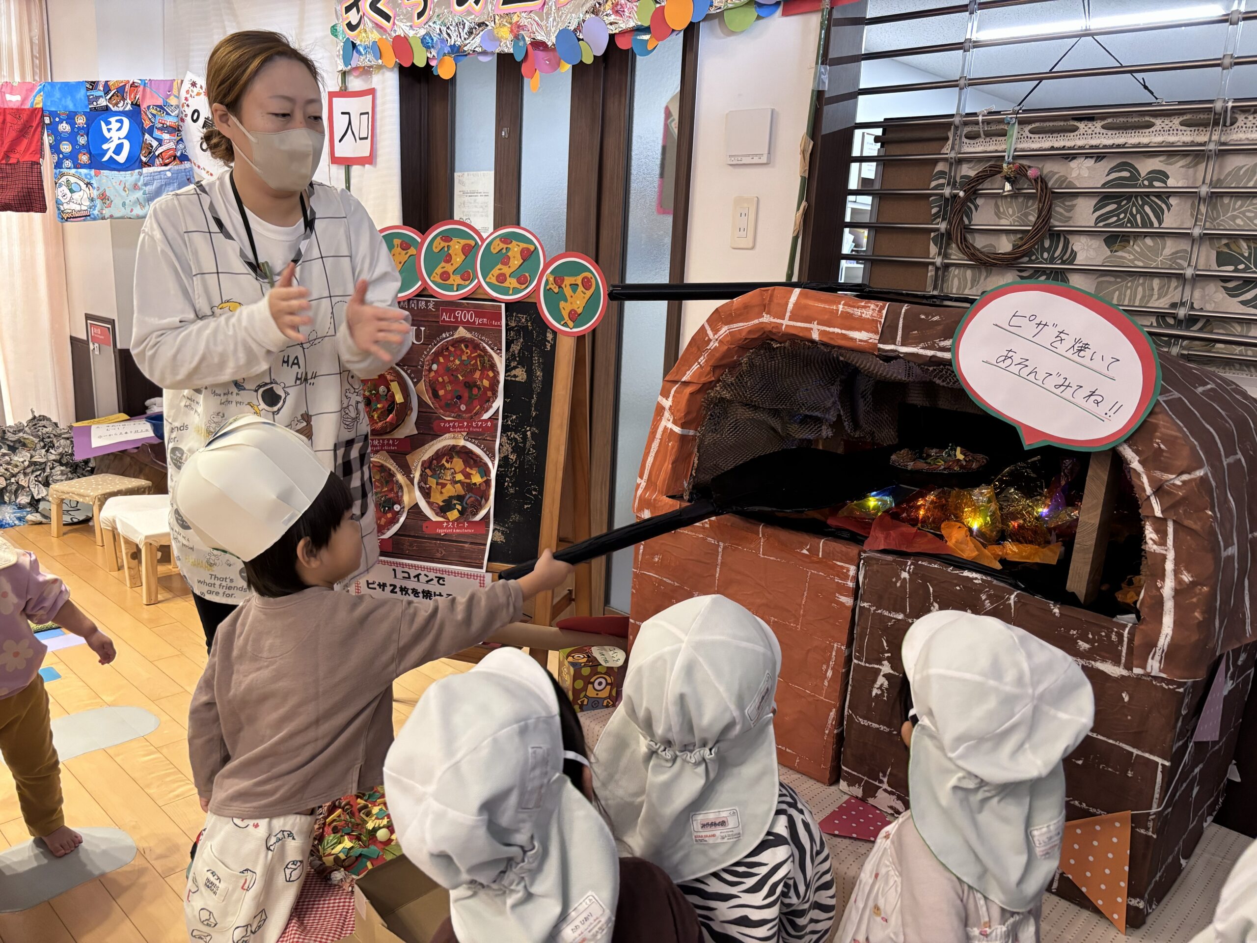 【作品展の共同制作で遊んだよ♪】 (きりん組:2歳児) 公開済み: 2025年12月1日更新: 2025年12月9日作成者: sakuranosatoカテゴリー: さくらの里保育園, さくらの里保育園ブログ 色んなお店屋さんでなりきり遊びをして楽しみました☆