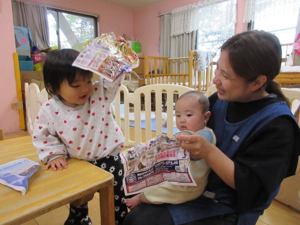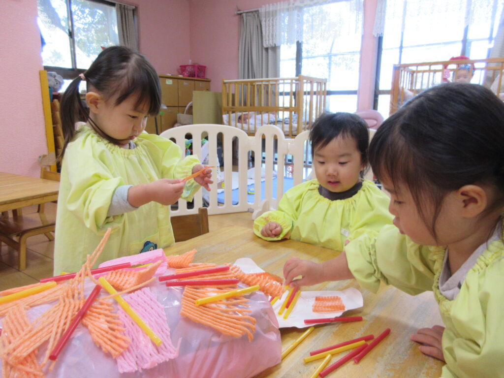 作るぞ~(うさぎ0歳児、1歳児) 公開済み: 2025年12月1日更新: 2025年12月1日作成者: hayamanookaカテゴリー: 端山の丘こども園ブログ 0歳児は新聞をビリビリ破ったり、お花紙をクシャッと丸めてその感触を楽しみ、1歳児はそれらをボンドでくっつけてみんなで作品を完成させました。作品展当日まで楽しみにして下さいね♪ 関連記事 可愛いオバケがたくさん💛(うさぎ0歳児、1歳児) 10月31日はハロウィンということで、園内でハロウィンパーティーがありました。仮装をしてお菓子をもらったり、可愛いダンスを披露しましたよ! 公開済み: 2024年11月6日更新: 2024年11月6日作成者: hayamanookaカテゴリー: 端山の丘こども園ブログ 自然が一杯?(きりん、2歳児) 公開済み: 2022年12月7日更新: 2022年12月7日作成者: hayamanookaカテゴリー: 端山の丘こども園ブログ しっかりとした足取りで!(ゆり、5歳児) 天王山に山登りに行きました。階段や、細い道が多いルートでしたが、周りの自然にも目を向けながら、しっかりとした足取りで登りました。 公開済み: 2023年10月27日更新: 2023年10月27日作成者: hayamanookaカテゴリー: 端山の丘こども園ブログ