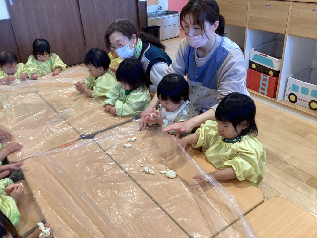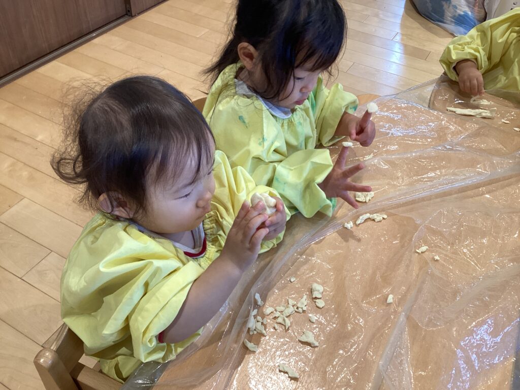 【ふわふわ・もちもち】小麦粉粘土で遊んだよ。(ひよこ組:0歳児) 公開済み: 2025年12月5日更新: 2025年12月12日作成者: sakuranosatoカテゴリー: さくらの里保育園, さくらの里保育園ブログ ギューってつぶしてみたり、トントンと叩いてみたり、不思議な感触を楽しみました。触れるのにドキドキする時は、ビニールの上から、指でツンツン☆ 指先を使って小さな動きも上手にできるようになってきました。
