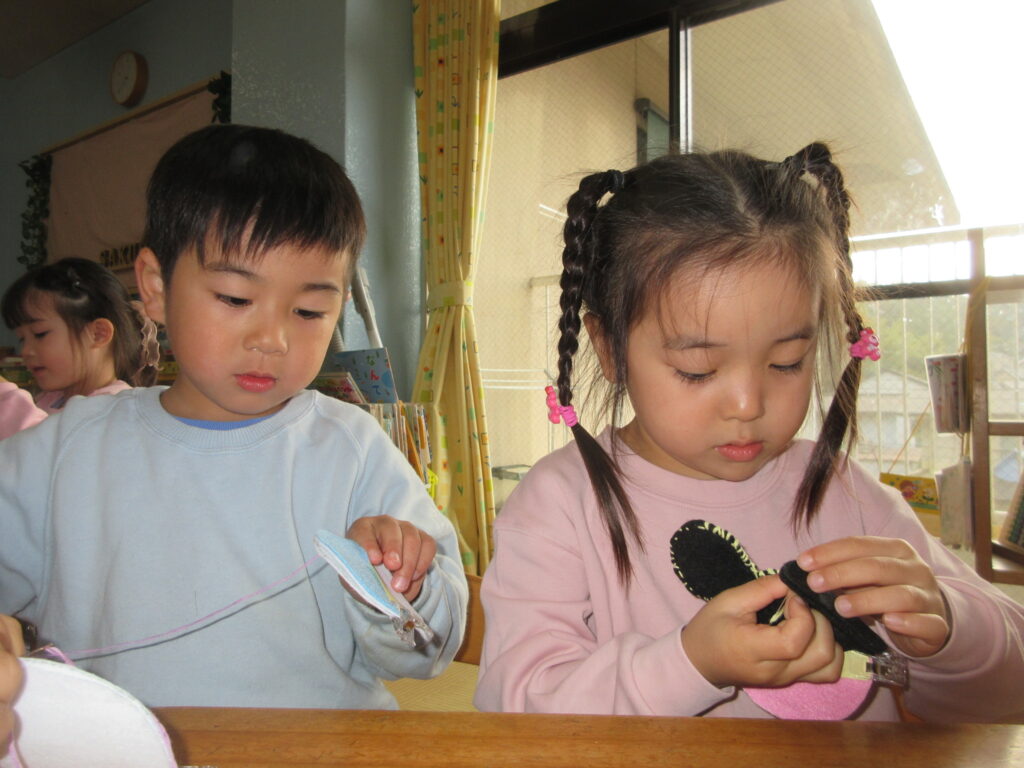 可愛いお針子さん(さくら、4歳児) 公開済み: 2025年12月5日更新: 2025年12月5日作成者: hayamanookaカテゴリー: 端山の丘こども園ブログ 作品展に取り組んでいます。縫いさしにチャレンジ! まつり縫いをしていて、一針一針夢中になっています。 関連記事 ぱこぱこぱんぱん♪(うさぎ0歳児、1歳児) お部屋でリズム遊び(カスタネット)をしました。指にゴムを通して、上手に鳴らして遊んでいました。 公開済み: 2023年7月7日更新: 2023年7月7日作成者: hayamanookaカテゴリー: 端山の丘こども園ブログ いい季節になりました(さくら、4歳児) 端山公園でランチ(*^-^*) その後、たーくさん遊びました!! 公開済み: 2022年10月5日更新: 2022年10月5日作成者: hayamanookaカテゴリー: 端山の丘こども園ブログ 飛び出すみんなのアートポン✨ 公開済み: 2022年12月19日更新: 2022年12月19日作成者: hayamanookaカテゴリー: 端山の丘こども園ブログ