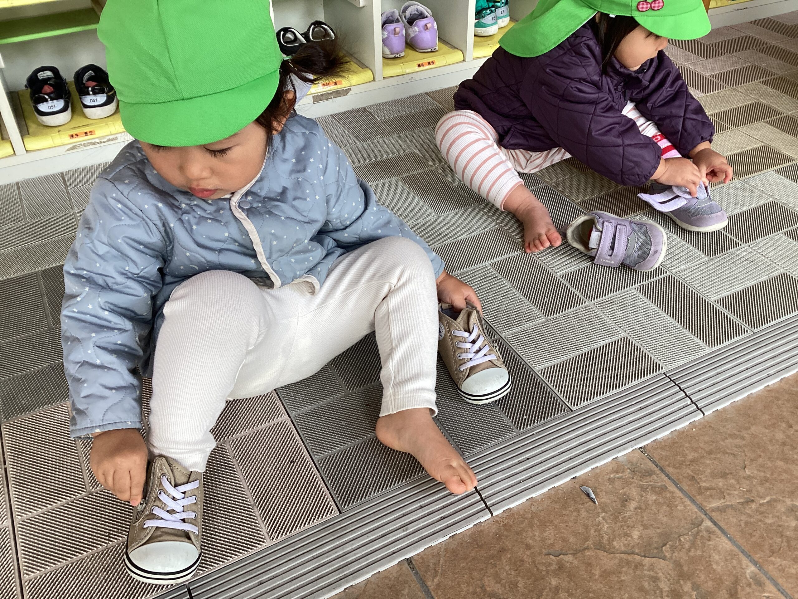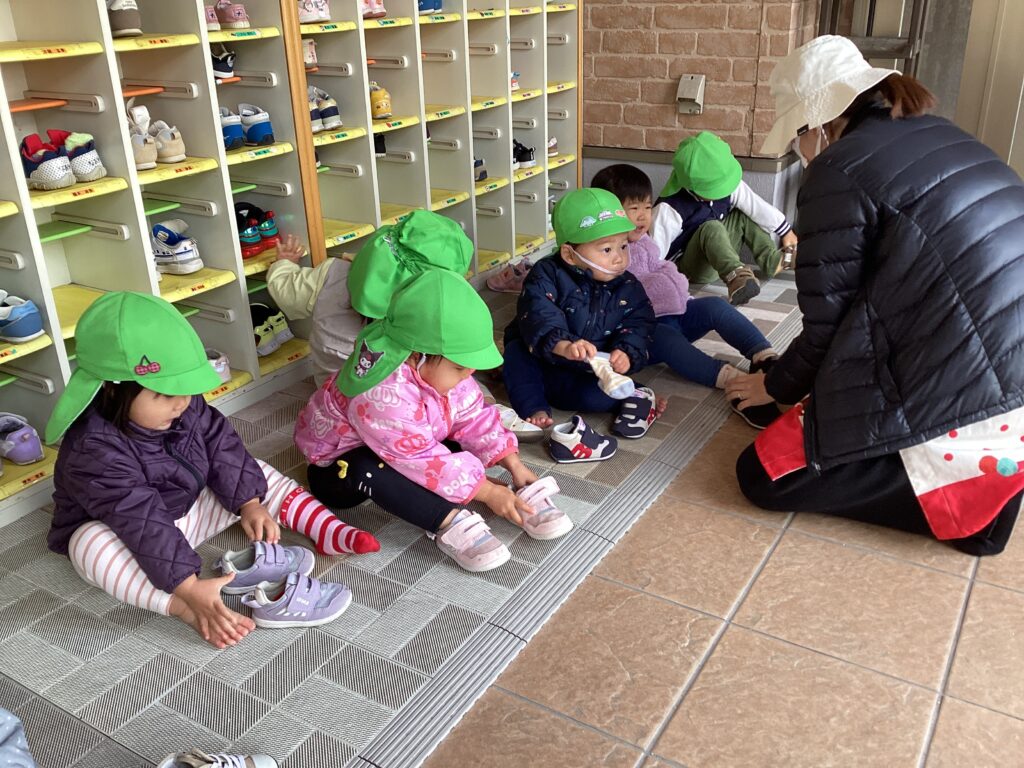 お散歩に行く前には…。(うさぎ組:1歳児) 公開済み: 2025年12月8日更新: 2025年12月12日作成者: sakuranosatoカテゴリー: さくらの里保育園, さくらの里保育園ブログ 「こうえんにいく~」と楽しそうな子ども達。靴箱の前では自分たちで靴を履こうと頑張っています。 自分の靴を持ってきて、【こうかなぁ~】と足を入れています。出来ない時は手伝ってもらって、みんなで公園へ「行ってきま~す☆」