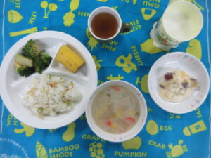 12月8日(月) 給食・おやつ献立 公開済み: 2025年12月8日更新: 2025年12月13日作成者: hayamanookaカテゴリー: 端山の丘こども園給食 <給食> 枝豆とじゃこの御飯 冬野菜のクリーム煮 ブロッコリーのごま和え バナナ <おやつ> 牛乳 米粉蒸しパン・さつまいも 関連記事 8月25日 お誕生日 ロールパン コーンスープ(玉ねぎ) コロッケ 添えきゅうり キャベツのツナサラダ すいか ☆お誕生日おめでとうございます。コロッケは子どもたちに大人気でした! 公開済み: 2021年8月26日更新: 2021年8月26日作成者: hayamanookaカテゴリー: 端山の丘こども園給食 10月12日 給食 ごはん 豆乳汁(野菜) 鶏肉のマーマレード焼き にんじんのシンプルサラダ フルーツカクテル 公開済み: 2021年10月12日更新: 2021年10月12日作成者: hayamanookaカテゴリー: 端山の丘こども園給食 7月18日(火) おやつ献立 今日はお弁当日でした♪ 〈おやつ〉 ・マカロニきなこ 公開済み: 2023年7月18日更新: 2023年7月18日作成者: hayamanookaカテゴリー: 端山の丘こども園給食