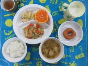 12月11日(木) 給食・おやつ献立 公開済み: 2025年12月11日更新: 2025年12月13日作成者: hayamanookaカテゴリー: 端山の丘こども園給食 <給食> 御飯 豆腐のすまし汁(はくさい) さけのちゃんちゃん焼き(しめじ) ベイクドじゃが みかん <おやつ> 牛乳 おからドーナツ 今日のドーナツは穴の開いたまーるいドーナツでした☆ 子ども達がいつもより喜んで食べてくれましたよ! 関連記事 8月18日(金) 給食・おやつ献立 〈給食〉 ・ごはん ・ふりかけ(じゃこ、ねぎ) ・豆腐と冬瓜のスープ ・豚肉とキャベツのみそ炒め ・もやしのごま塩あえ 〈おやつ〉 ・牛乳 ・パイナップルゼリー 公開済み: 2023年8月18日更新: 2023年8月19日作成者: hayamanookaカテゴリー: 端山の丘こども園給食 1月30日(月) 給食・おやつ献立 ・さけとひじきの混ぜごはん ・ポトフ(冬野菜) ・ブロッコリーの玉ねぎドレッシング ・オレンジ 〈おやつ〉 ・牛乳 ・ナポリタン 公開済み: 2023年1月30日更新: 2023年2月3日作成者: hayamanookaカテゴリー: 端山の丘こども園給食 12月20日(火) 給食・おやつ献立 ・ごはん ・おかず汁 ・さわらと人参の煮物 ・小松菜とキャベツのしらすサラダ 〈おやつ〉 ・牛乳 ・豆乳みかんババロア風 公開済み: 2022年12月20日更新: 2022年12月22日作成者: hayamanookaカテゴリー: 端山の丘こども園給食