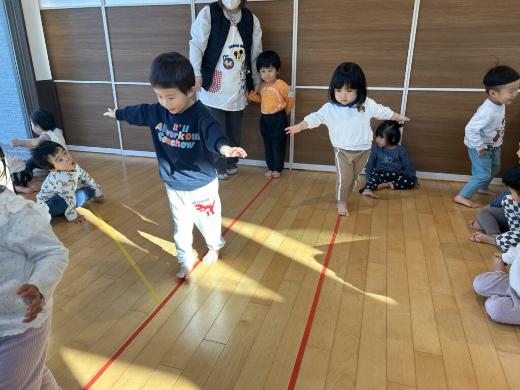 慎重に!慎重に!(きりん組:2歳児) 公開済み: 2025年12月16日更新: 2025年12月26日作成者: sakuranosatoカテゴリー: さくらの里保育園, さくらの里保育園ブログ 運動遊びが大好きな子ども達。お部屋の赤い線の上を平均台のように慎重に・・・