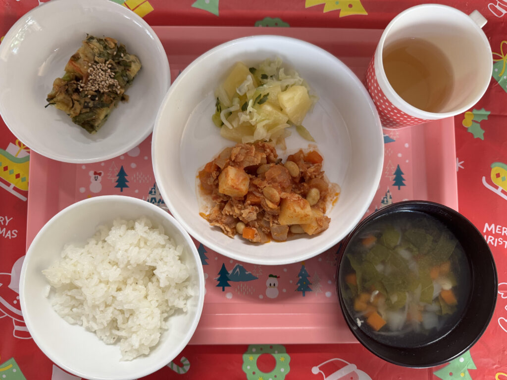 12月16日(火)の給食とおやつ 公開済み: 2025年12月16日更新: 2025年12月16日作成者: sakuranosatoカテゴリー: さくらの里保育園, さくらの里保育園園・給食だより 【給食】 ごはん かぶのスープ チリコンカン キャベツのパインサラダ 【おやつ】 野菜チヂミ
