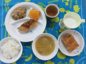 6月9日(金) 給食・おやつ献立 〈給食〉 ・ごはん ・みそ汁(豆腐・あげ) ・白身魚の香り蒸し ・揚げなす 〈おやつ〉 ・牛乳 ・ホットケーキ 公開済み: 2023年6月9日更新: 2023年6月12日作成者: hayamanookaカテゴリー: 端山の丘こども園給食