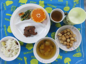 12月19日(金) 給食・おやつ献立 公開済み: 2025年12月19日更新: 2025年12月20日作成者: hayamanookaカテゴリー: 端山の丘こども園給食 <給食> さつまいも御飯 豆腐のすまし汁(だいこん) レバーの胡麻ソースからめ 白菜とほうれん草のおかか和え みかん <おやつ> 牛乳 お麩ラスク 関連記事 10月20日 お誕生会おやつ カラフルカップ 公開済み: 2021年10月21日更新: 2021年10月21日作成者: hayamanookaカテゴリー: 端山の丘こども園給食 3月23日(木) 給食・おやつ献立 ・手作りわかめごはん ・ミートボールのトマトシチュー ・切干大根とツナのサラダ ・りんご 〈おやつ〉 ・牛乳 ・凍り豆腐のきなこトースト 公開済み: 2023年3月23日更新: 2023年3月31日作成者: hayamanookaカテゴリー: 端山の丘こども園給食 2月22日(水) 給食・おやつ献立 ・ホットドック ・コーンクリームスープ ・ナゲット ・きゅうりと大根のピクルス ・りんご 〈おやつ〉 ・牛乳 ・オレンジケーキ 公開済み: 2023年2月22日更新: 2023年3月4日作成者: hayamanookaカテゴリー: 端山の丘こども園給食