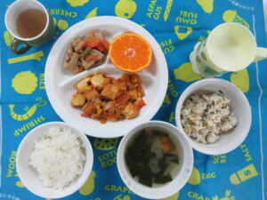 10月12日(水) 給食・おやつ献立 ・じゃこまぜごはん ・じゃが芋のスープ ・豚肉となすのなべしぎ ・かぶときゅうりのサラダ ・みかん缶 〈おやつ〉 ・牛乳 ・豆腐フルーツ寒天 公開済み: 2022年10月12日更新: 2022年10月17日作成者: hayamanookaカテゴリー: 端山の丘こども園給食