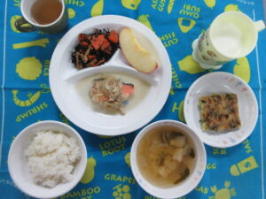 1月8日(木) 給食・おやつ献立 公開済み: 2026年1月8日更新: 2026年1月10日作成者: hayamanookaカテゴリー: 端山の丘こども園給食 <給食> 御飯 豆腐のすまし汁(だいこん) 鮭の酒蒸し ひじきの煮物(にんじん) りんご <おやつ> 牛乳 チヂミ(小松菜・豆腐) 関連記事 10月3日(月) 給食・おやつ献立 ・豆腐丼(カレー風味) ・すまし汁 ・きゅうりのゆかり和え ・ヨーグルト(オレンジ) 〈おやつ〉 ・牛乳 ・にんじんおやき 公開済み: 2022年10月3日更新: 2022年10月17日作成者: hayamanookaカテゴリー: 端山の丘こども園給食 11月22日 給食 みそ汁(さつま芋、もやし) 豚肉のもち米蒸し チンゲン菜のとろみ炒め 公開済み: 2021年11月24日更新: 2021年11月24日作成者: hayamanookaカテゴリー: 端山の丘こども園給食 7月7日(木) 給食・おやつ献立 今日は七夕☆ お星さまがいっぱいのメニューがとってもカワイイです☆ ・トマトと鶏ひき肉のおこわ ・キラキラスープ ・白身魚のフリット(カレー味) ・星形人参の甘煮 ・野菜サラダ 〈おやつ〉 ・牛乳 ・豆乳フルーツかんてん 公開済み: 2022年7月7日更新: 2022年7月15日作成者: hayamanookaカテゴリー: 端山の丘こども園給食