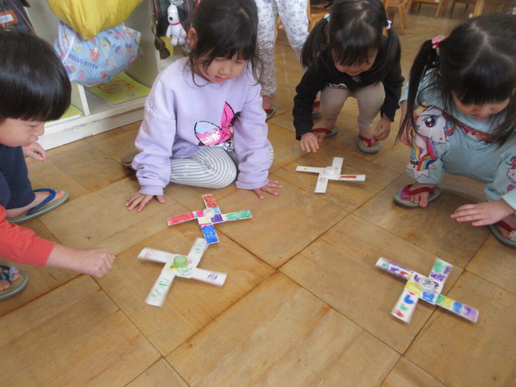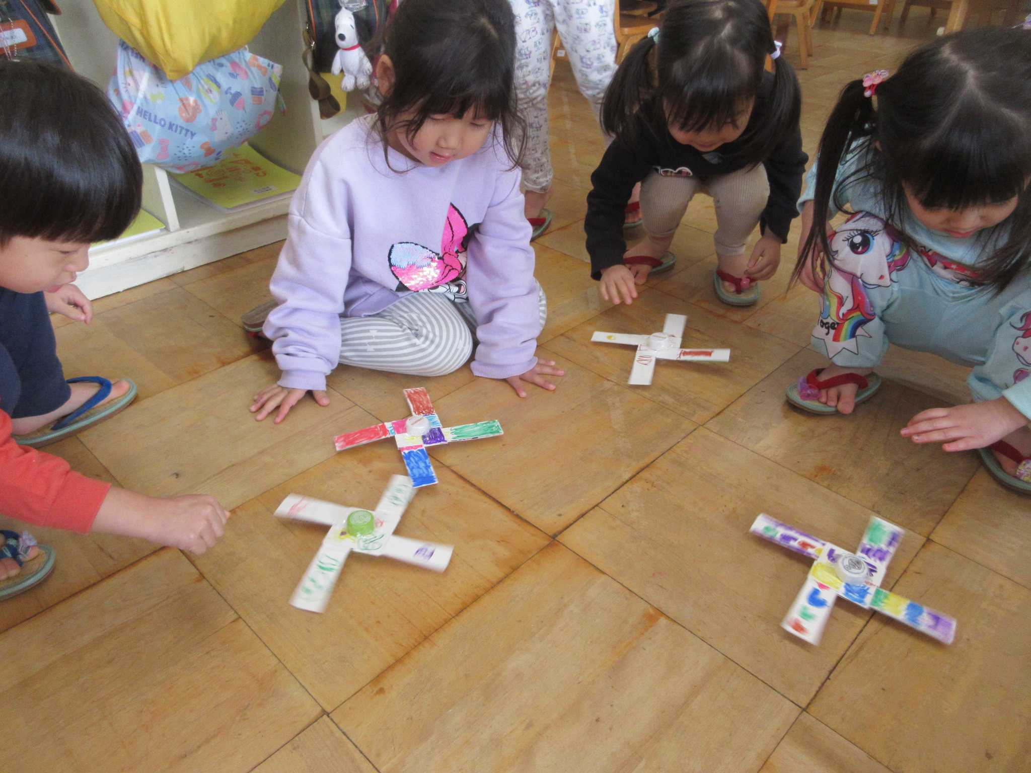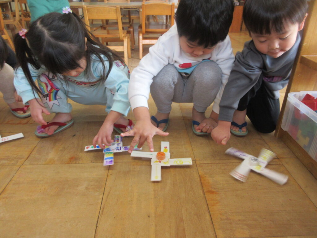 くるくる回った!(たんぽぽ、3歳児) 公開済み: 2026年1月9日更新: 2026年1月9日作成者: hayamanookaカテゴリー: 端山の丘こども園ブログ お正月遊び第一弾は「コマ作り」回してみると、描いた模様が変化して面白いです!! 関連記事 かっこいい??(さくら、4歳児) 運動会では自分の体より大きい ”カラーガード” に挑戦します。憧れのカラーガードを持っている姿、かっこいいです!! 公開済み: 2024年6月26日更新: 2024年7月2日作成者: hayamanookaカテゴリー: 端山の丘こども園ブログ 作品展は、もうすぐ!(きりん、2歳児) 共同製作をしました。かっぱを製作中なのですが、目をつけてみると、だんだんかっぱらしくなってきました。みんなで一緒に作ると楽しいね! 公開済み: 2024年12月3日更新: 2024年12月3日作成者: hayamanookaカテゴリー: 端山の丘こども園ブログ じょうずに描けるよ(きりん、2歳児) 七夕制作をしました。きゅうりに、白か黒か自分で選んでいがいがを描いていきました。とんとんと描く子、まるまると描く子、様々でしたが、かわいいきゅうりが出来ました。笹に飾るのが楽しみです。 公開済み: 2025年6月16日更新: 2025年6月16日作成者: hayamanookaカテゴリー: 端山の丘こども園ブログ