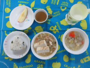 1月15日(木) 給食・おやつ献立 公開済み: 2026年1月15日更新: 2026年1月15日作成者: hayamanookaカテゴリー: 端山の丘こども園給食 今日は「収穫祭」でした! さくら・ゆり組さんがブレンドファームの皆さんと一緒に育てた冬野菜をたっぷり使ってお鍋を作りましたよ♪ <給食> 鍋パーティー わかめおにぎり みかん(乳児) りんご(幼児) <おやつ> 牛乳 豚汁 関連記事 2月8日(水) 給食・おやつ献立 ・ごはん ・豆乳汁 ・さけのサラダ焼き ・きんぴらごぼう 〈おやつ〉 ・牛乳 ・米粉の甘酒蒸しパン 公開済み: 2023年2月8日更新: 2023年2月13日作成者: hayamanookaカテゴリー: 端山の丘こども園給食 10月8日(土) 給食献立 ・焼きそば ・オレンジ 公開済み: 2022年10月8日更新: 2022年10月17日作成者: hayamanookaカテゴリー: 端山の丘こども園給食 4月25日(木)給食・おやつ献立 <給食> 御飯 みそ汁(さつまいも・なす) たらのムニエル(米粉) かぶのそぼろ煮 ヨーグルト(バナナ) <おやつ> 牛乳 手作りパン 公開済み: 2024年4月25日更新: 2024年4月30日作成者: hayamanookaカテゴリー: 端山の丘こども園給食