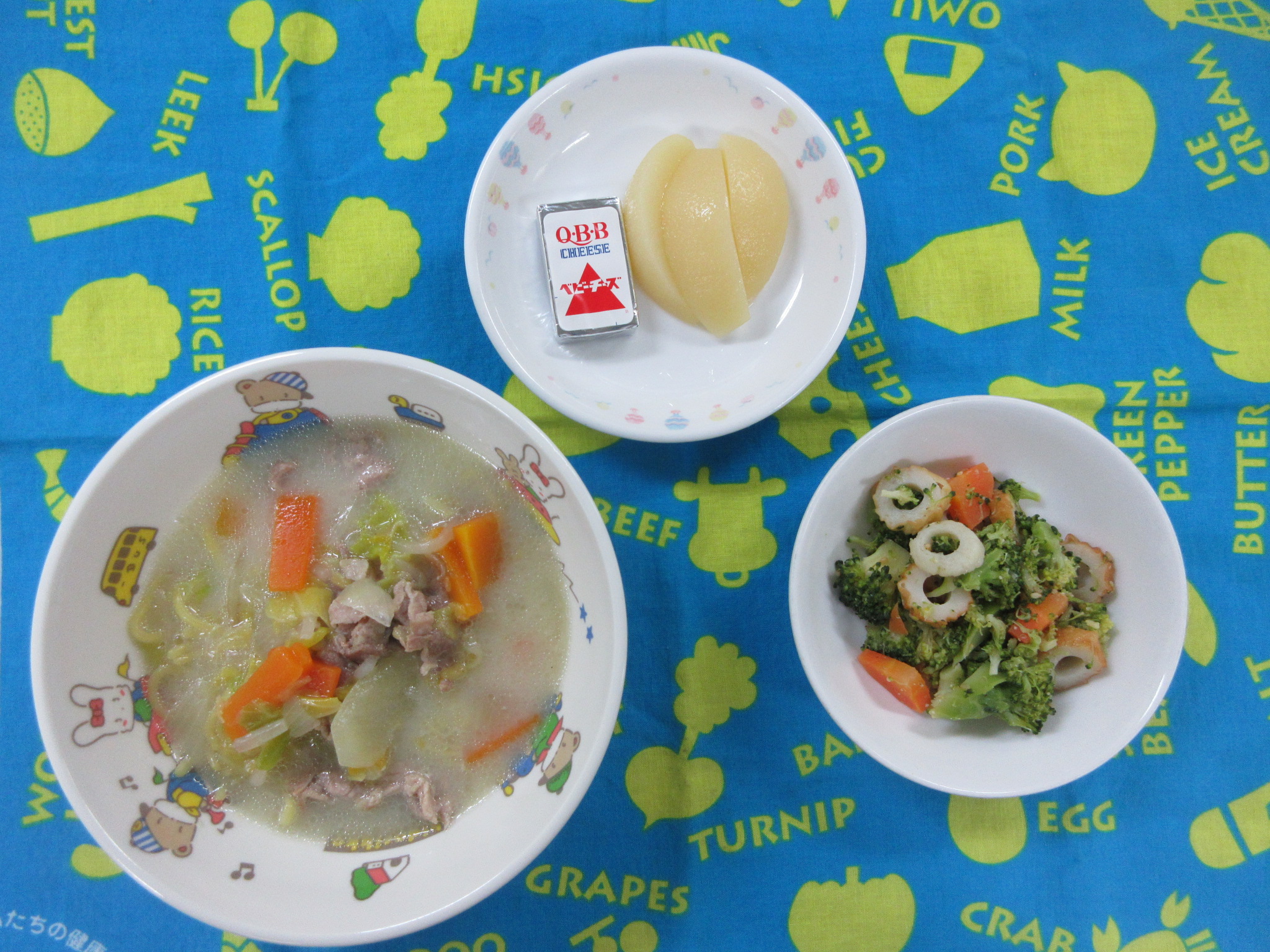 1月17日(土) 給食献立 公開済み: 2026年1月17日更新: 2026年1月24日作成者: hayamanookaカテゴリー: 端山の丘こども園給食 <給食> ちゃんぽんめん ブロッコリーのごま酢あえ もも缶 ベビーチーズ 関連記事 12月26日(木) 給食・おやつ献立 <給食> ハリハリわかめ御飯 野菜のスープ煮 マーボー豆腐(キッズ) バナナ <おやつ> 牛乳 豆乳ゼリー(小倉) 公開済み: 2024年12月26日更新: 2024年12月26日作成者: hayamanookaカテゴリー: 端山の丘こども園給食 5月18日(木) 給食・おやつ献立 〈給食〉 ・ごはん ・みそ汁(さつまいも・わかめ) ・白身魚のフリット ・蒸し野菜のサラダ ・バナナ 〈おやつ〉 ・牛乳 ・厚揚げきな粉 公開済み: 2023年5月18日更新: 2023年5月18日作成者: hayamanookaカテゴリー: 端山の丘こども園給食 2月13日(火) 給食・おやつ献立 〈給食〉 ・ごはん ・すまし汁(鶏肉・大根) ・さばの塩焼き ・冬の焼き野菜 ・りんご 〈おやつ〉 ・牛乳 ・スイートポテト 公開済み: 2024年2月13日更新: 2024年2月14日作成者: hayamanookaカテゴリー: 端山の丘こども園給食