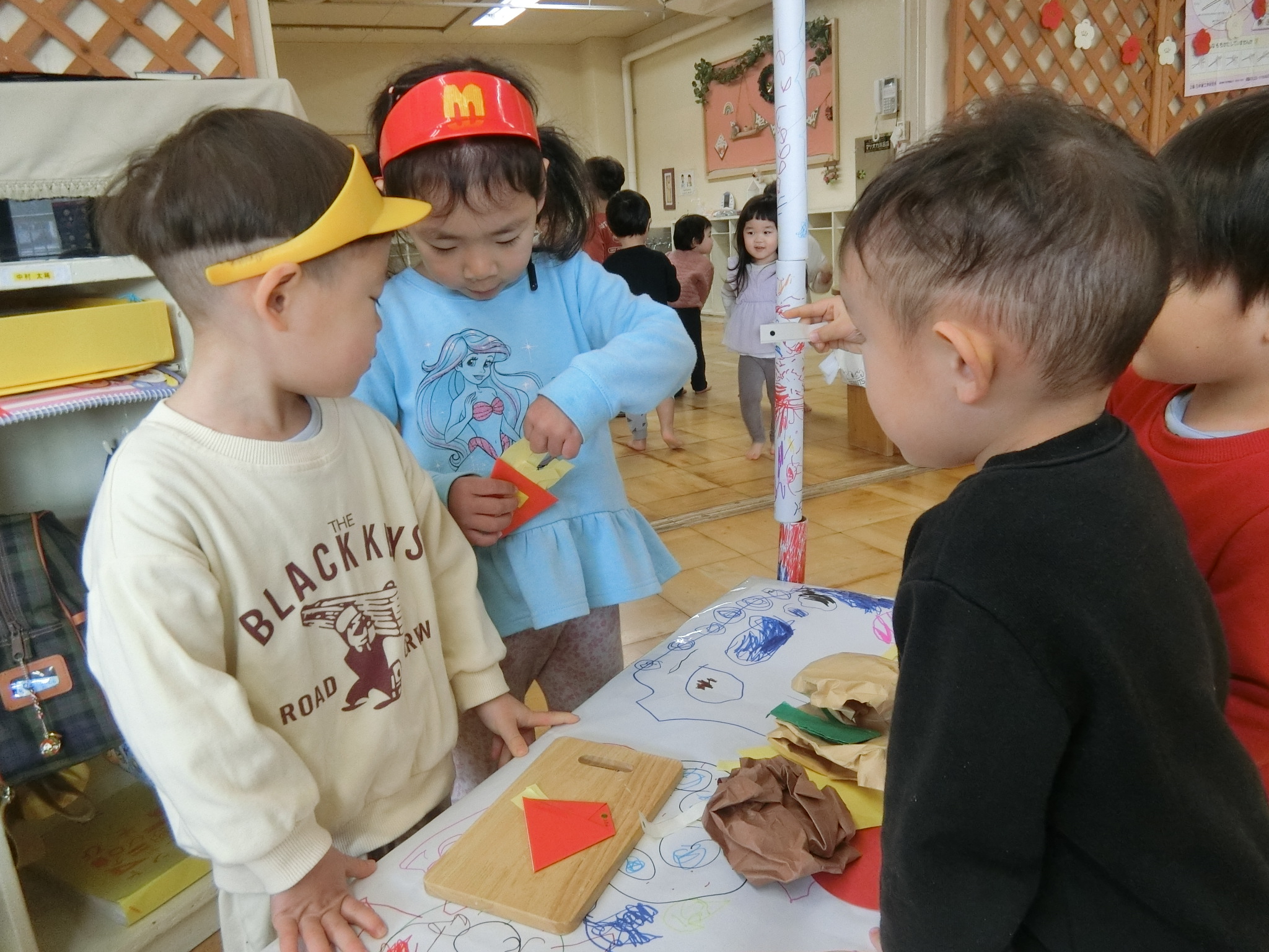 いらっしゃいませ~(たんぽぽ、3歳児) 公開済み: 2026年1月19日更新: 2026年1月19日作成者: hayamanookaカテゴリー: 端山の丘こども園ブログ たんぽぽ商店、オープンしました!! うさぎ組、きりん組が遊びに来てくれて、やる気up!!とってもにぎやかなお店屋さんごっこになりました!! 関連記事 早く食べたいね~(たんぽぽ、3歳児) クッキングでお好み焼きを作りました。キャベツを千切ったり、粉や卵をこぼさないように混ぜました。ホットプレートで焼くと「いいにおい!」と、嬉しそうな子ども達。とっても美味しかったでです! 公開済み: 2025年11月7日更新: 2025年11月7日作成者: hayamanookaカテゴリー: 端山の丘こども園ブログ なーんか不思議な感じがするな~(きりん、2歳児) プールが始まる前に、ビーチサンダルをはいてあるく練習をしました。上手に足の指を入れて自分ではいていました。歩くのも上手でしたよ。 公開済み: 2024年7月17日更新: 2024年7月17日作成者: hayamanookaカテゴリー: 端山の丘こども園ブログ 練習は、ばっちり!!(うさぎ0歳児、1歳児) お部屋で芋ほりごっこをしました!紐を引っ張ると、ゴロゴロ出てくるお芋!「あったー!」と、大喜びの子供達でした。来週本当のお芋を掘るのが楽しみです! 公開済み: 2024年10月29日更新: 2024年10月29日作成者: hayamanookaカテゴリー: 端山の丘こども園ブログ
