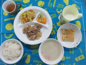 1月23日(金) 給食・おやつ献立 公開済み: 2026年1月23日更新: 2026年1月24日作成者: hayamanookaカテゴリー: 端山の丘こども園給食 <給食> 御飯 豆乳汁(はくさい・にんじん) 大根と豚肉の炒め煮 キャベツとじゃこの酢和え フルーツカクテル(キウイ) <おやつ> 牛乳 スートポテト(米粉・ごま) 関連記事 4月26日の給食 豆腐丼(カレー風味)、ジャガイモ入り豚汁、小松菜ともやしのごま和え バナナ? 公開済み: 2021年4月26日更新: 2021年4月26日作成者: hayamanookaカテゴリー: 端山の丘こども園給食 1月26日(木) 給食・おやつ献立 公開済み: 2023年1月26日更新: 2023年1月27日作成者: hayamanookaカテゴリー: 端山の丘こども園給食 2月19日(水) 給食・おやつ献立 <給食> ゆかり御飯 コーンスープ レバーのにんにく風味焼き 蒸し野菜のサラダ みかん <おやつ> 牛乳 ポップコーン(のりしお) 公開済み: 2025年2月19日更新: 2025年2月20日作成者: hayamanookaカテゴリー: 端山の丘こども園給食