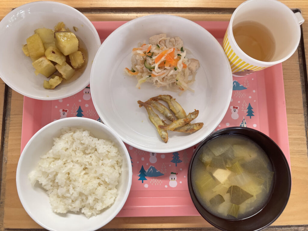 1月23日(金)の給食とおやつ 公開済み: 2026年1月26日更新: 2026年1月26日作成者: sakuranosatoカテゴリー: さくらの里保育園, さくらの里保育園園・給食だより 【給食】 ごはん 豆腐みそ汁 ワカサギのカレー揚げ 切干大根のサラダ 【おやつ】 大学芋