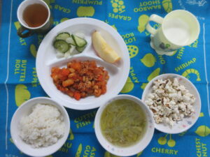 1月27日(火) 給食・おやつ献立 公開済み: 2026年1月27日更新: 2026年1月27日作成者: hayamanookaカテゴリー: 端山の丘こども園給食 <給食> 御飯 はるさめスープ(キャベツ) ポークビーンズ かぶときゅうりのサラダ りんご <おやつ> 牛乳 ポップコーン(あおのり) 関連記事 5月15日(月) 給食・おやつ献立 〈給食〉 ・和風トマトライス(カレー) ・きゅうりと長芋のさっぱり漬け ・バナナ 〈おやつ〉 ・牛乳 ・米粉蒸しパン、りんご 公開済み: 2023年5月15日更新: 2023年5月16日作成者: hayamanookaカテゴリー: 端山の丘こども園給食 3月25日 給食 ごはん クラムチャウダー 鶏肉のマーマレード焼き コールスローサラダ りんご 公開済み: 2022年3月28日更新: 2022年3月28日作成者: hayamanookaカテゴリー: 端山の丘こども園給食 ☆1月誕生会おやつ ☆1月誕生会のおやつはフルーツとホイップクリームたっぷりの カラフルカップでした。 公開済み: 2021年1月20日更新: 2021年1月20日作成者: hayamanookaカテゴリー: 端山の丘こども園給食