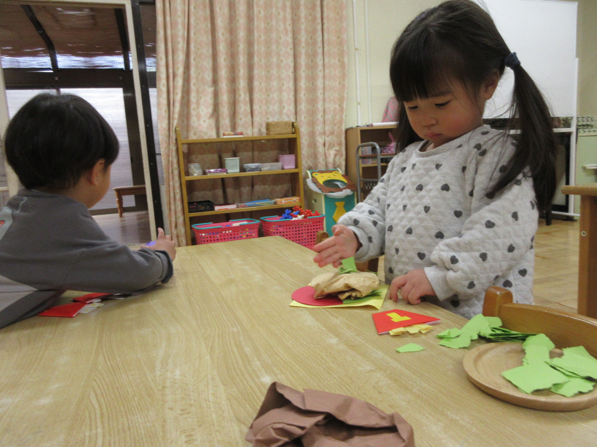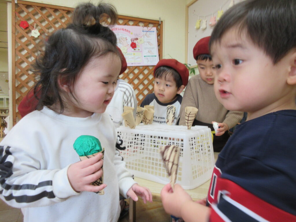 ミントアイス、食べちゃおうかな(うさぎ0歳児、1歳児) 公開済み: 2026年1月30日更新: 2026年1月30日作成者: hayamanookaカテゴリー: 端山の丘こども園ブログ アイスクリームとハンバーガー屋さんになりきった、たんぽぽ組さんのお兄さん、お姉さんが「いらっしゃいませ~」と出迎えてくれました。それぞれ食べたい物を注文して、テーブルに座ったりと楽しいひとときを過ごしました! 関連記事 ふわふわ飛んで行ったよね!(たんぽぽ、3歳児) 絵画で「しゃぼん玉」を描きました! クレパスで〇を描いた所に水を塗って、さらに絵の具を塗っていくと・・・どんどんにじんで素敵なしゃぼん玉になりました!! 公開済み: 2025年6月6日更新: 2025年6月6日作成者: hayamanookaカテゴリー: 未分類, 端山の丘こども園ブログ 嬉しい重さだね(ゆり、5歳児) みんなでタスキを繋いで走り切った駅伝大会。見事 ★総合三位★ に入賞しました。やったね!! 公開済み: 2022年12月5日更新: 2022年12月5日作成者: hayamanookaカテゴリー: 端山の丘こども園ブログ 福笑い遊びをしました(うさぎ0歳児、1歳児)) お正月の遊びとして福笑いに挑戦しました。子供達が目や鼻、口の位置などをよく考えながら置いていくと、いろいろな表情の顔ができて、とっても面白かったです。 公開済み: 2025年1月22日更新: 2025年1月22日作成者: hayamanookaカテゴリー: 端山の丘こども園ブログ