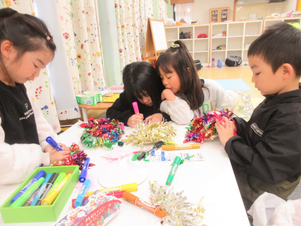 メリークリスマス! 公開済み: 2026年1月30日更新: 2026年1月27日作成者: hayamanookaカテゴリー: 端山の丘こども園学童 オーナメントを作って、キラキラモールを飾り、すてきなクリスマスモールが出来ました。 関連記事 甘酸っぱかったね? 今が旬のいちご狩りに行ってきました。じっくり自分の目で美味しそうないちごを選んで、お腹一杯食べていました。 公開済み: 2024年5月23日更新: 2024年5月23日作成者: hayamanookaカテゴリー: 端山の丘こども園学童 しゅーんと滑るよ! すくすく広場でそりすべり。よく滑るポイントを探して、何度も滑って楽しんでいました。 公開済み: 2021年10月18日更新: 2021年10月18日作成者: hayamanookaカテゴリー: 端山の丘こども園学童 跳んで跳んで大縄跳び。 波打たせたり、回したり、くぐったり、大繩一本で色々な遊びを楽しみました。 公開済み: 2023年5月8日更新: 2023年5月8日作成者: hayamanookaカテゴリー: 端山の丘こども園学童
