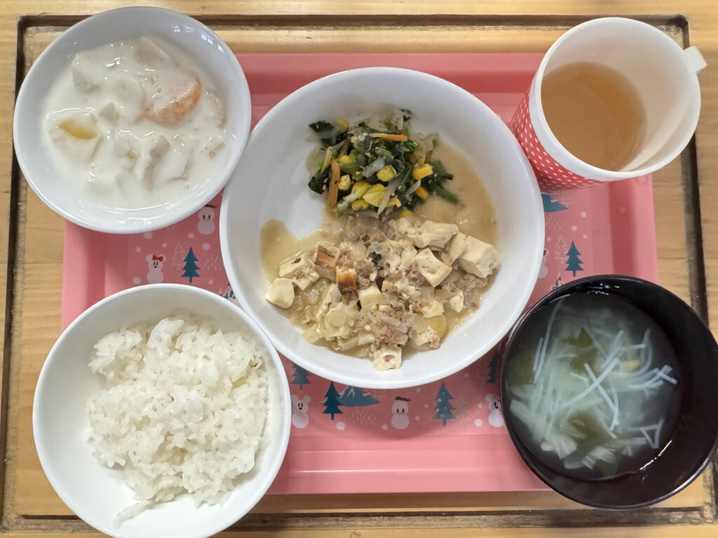 1月30日(金)の給食とおやつ 公開済み: 2026年1月30日更新: 2026年1月30日作成者: sakuranosatoカテゴリー: さくらの里保育園, さくらの里保育園園・給食だより 【給食】 ごはん はるさめスープ マーボー豆腐 ほうれん草のナムル 【おやつ】 フルーツヨーグルト和え