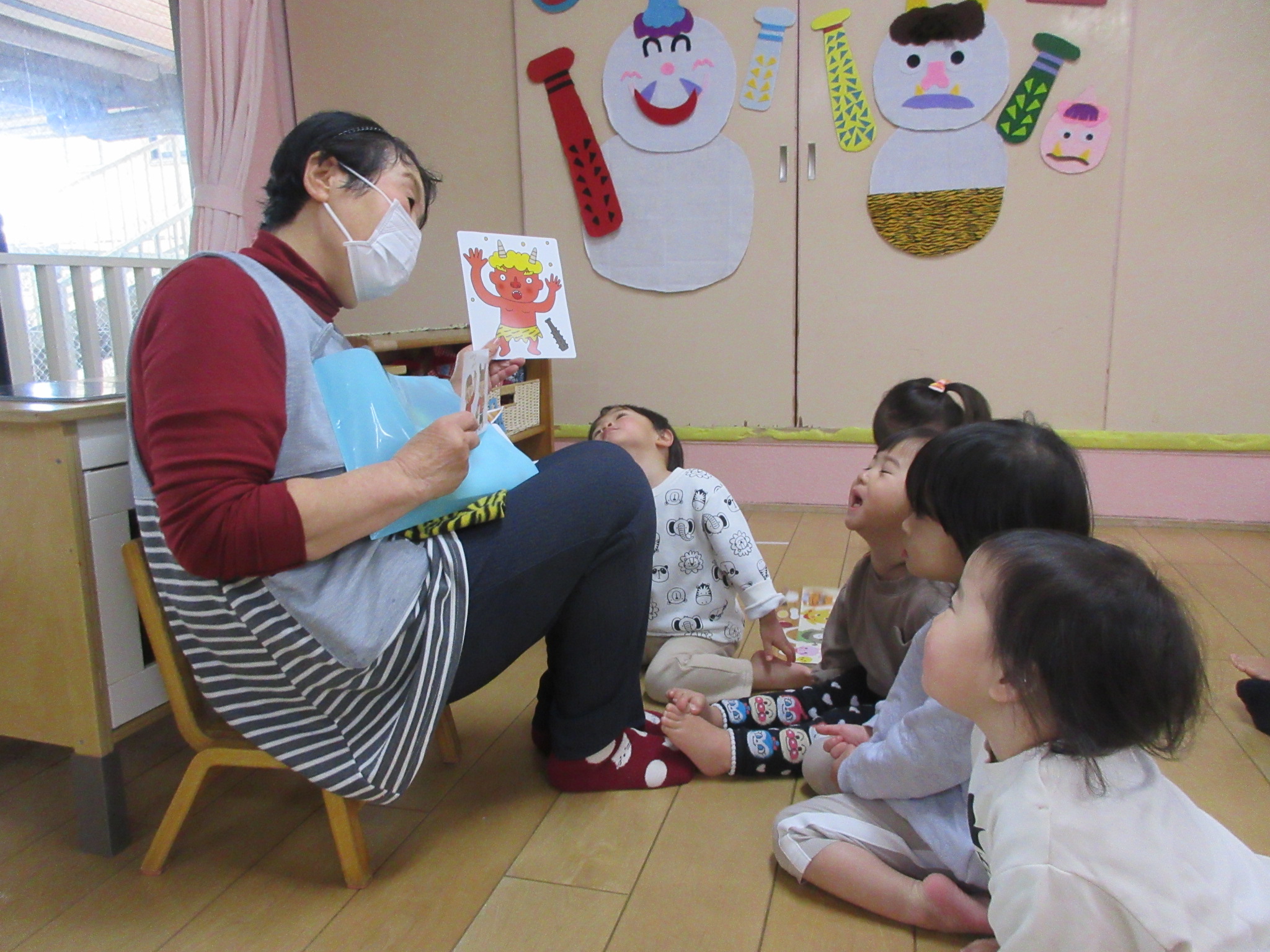 鬼さん怖かったねー(うさぎ0歳児、1歳児) 公開済み: 2026年2月5日更新: 2026年2月5日作成者: hayamanookaカテゴリー: 端山の丘こども園ブログ 今日は待ちに待った節分祭でした。鬼さんが来る前は「鬼は外しよな~」とお友達と話し合いながら気合ばっちりの子ども達!いざ鬼を目の前にすると迫力にびっくりして泣いてしまいました・・・でも無事に退治することが出来ました。 関連記事 ワクワククッキング?(たんぽぽ、3歳児) 大好きなクッキング。給食の先生も一緒に携わって下さり、食への興味も深まります。 公開済み: 2024年2月28日更新: 2024年2月28日作成者: hayamanookaカテゴリー: 端山の丘こども園ブログ こねこね~(うさぎ0歳児、1歳児) みんなが大好きな小麦粉粘土遊びをしました。何度も経験している子や、初めての0歳児さんもいたので、粉の感触や、食紅を入れて色がつく様子など、一つずつの工程を楽しみました。 公開済み: 2025年10月10日更新: 2025年10月10日作成者: hayamanookaカテゴリー: 端山の丘こども園ブログ あんまり急いでごっつんこ♪(うさぎ0歳児、1歳児) 音楽に合わせてリトミックをしました。動物のまねっこで、アリさんに変身! ハイハイして♪あっち行ってチョンチョン、こっち行ってチョン♪ 公開済み: 2023年6月7日更新: 2023年6月7日作成者: hayamanookaカテゴリー: 端山の丘こども園ブログ