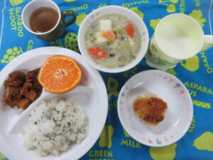 2月6日(金) 公開済み: 2026年2月6日更新: 2026年2月7日作成者: hayamanookaカテゴリー: 端山の丘こども園給食 <給食> ハリハリわかめ御飯 豆腐のシチュー レバーと芋の甘辛焼き(ごま) みかん <おやつ> 牛乳 五平餅 関連記事 3月27日(月) 給食・おやつ献立 ・菜飯(小松菜) ・五目みそ汁(かぼちゃ・大根) ・炒り豆腐(ちくわ・ひじき) ・磯辺さつまいも 〈おやつ〉 ・牛乳 ・フルーツヨーグルト 公開済み: 2023年3月27日更新: 2023年3月31日作成者: hayamanookaカテゴリー: 端山の丘こども園給食 2月6日(木) 給食・おやつ献立 <給食> 御飯 みそ汁(かぼちゃ・ねぎ) さばの竜田揚げ 白和え(ほうれん草・にんじん・ごま) りんご <おやつ> 牛乳 マカロニきなこ 公開済み: 2025年2月6日更新: 2025年2月7日作成者: hayamanookaカテゴリー: 端山の丘こども園給食 10月9日(水) 給食・おやつ献立 〈給食〉 ・ごはん ・みそ汁(なす・わかめ) ・豆腐の五目焼き ・チンゲン菜のとろみ炒め ・ヨーグルト(りんご) 〈おやつ〉 ・牛乳 ・おにぎり(じゃこ・ごま) 公開済み: 2024年10月9日更新: 2024年10月17日作成者: hayamanookaカテゴリー: 端山の丘こども園給食