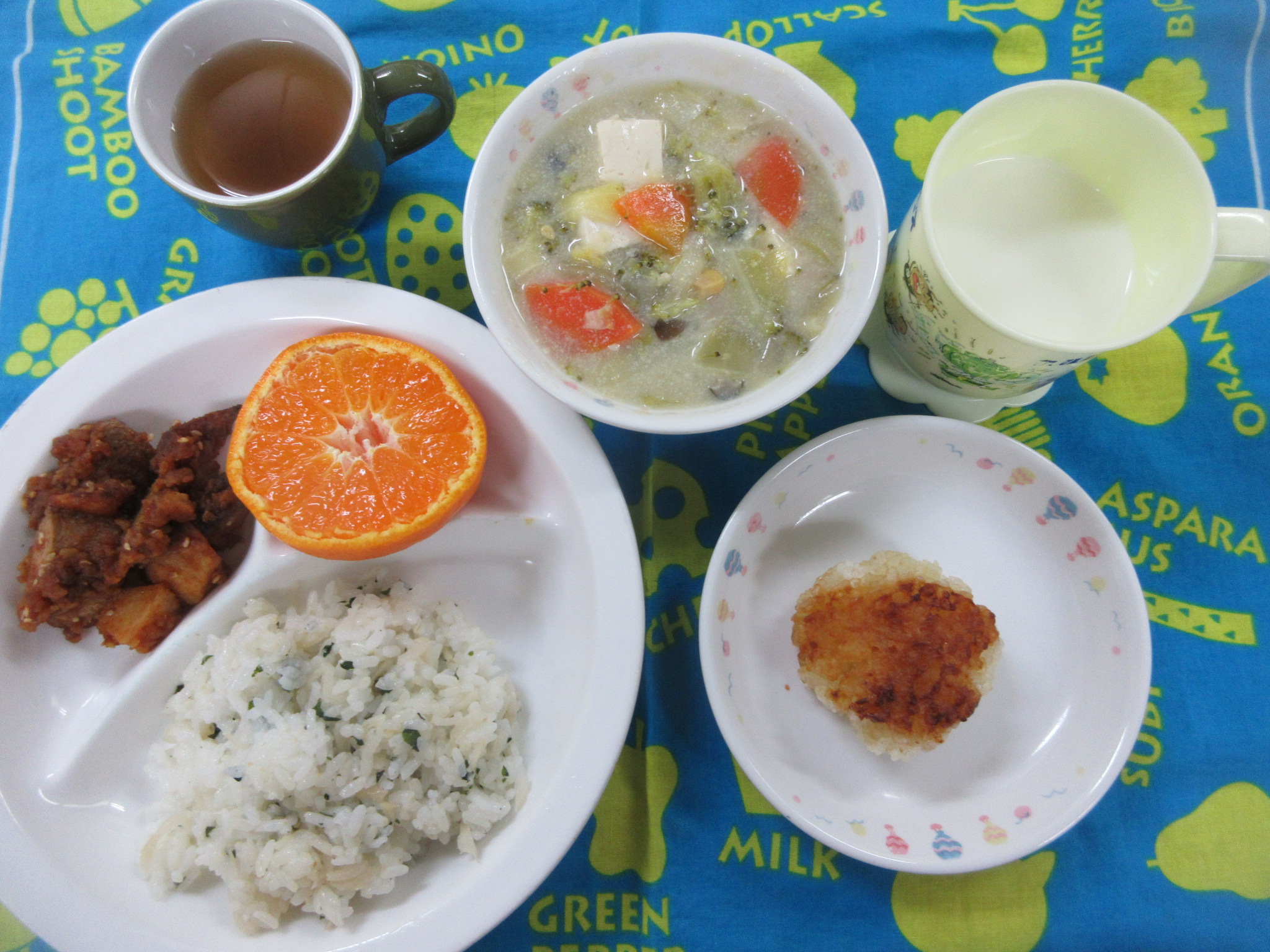 10月9日(水) 給食・おやつ献立 〈給食〉 ・ごはん ・みそ汁(なす・わかめ) ・豆腐の五目焼き ・チンゲン菜のとろみ炒め ・ヨーグルト(りんご) 〈おやつ〉 ・牛乳 ・おにぎり(じゃこ・ごま) 公開済み: 2024年10月9日更新: 2024年10月17日作成者: hayamanookaカテゴリー: 端山の丘こども園給食