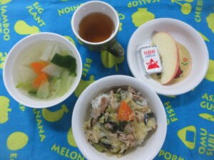 7月12日(土) 給食献立 <給食> ビーフン五目 わかめスープ(キャベツ) オレンジ ベビーチーズ 公開済み: 2025年7月12日更新: 2025年7月12日作成者: hayamanookaカテゴリー: 端山の丘こども園給食