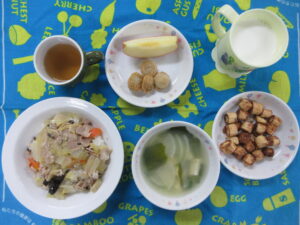 2月9日(月) 給食・おやつ献立 公開済み: 2026年2月9日更新: 2026年2月14日作成者: hayamanookaカテゴリー: 端山の丘こども園給食 <給食> 中華丼(はくさい) 豆腐スープ(わかめ) さといものごまがらめ りんご <おやつ> 牛乳 お麩ラスク(ココア) 関連記事 5月29日 給食 けんちんうどん オレンジ ベビーチーズ 公開済み: 2021年6月1日更新: 2021年6月1日作成者: hayamanookaカテゴリー: 端山の丘こども園給食 5月25日(水) 給食・おやつ献立 ひじきチャーハン 中華スープ(野菜) 鶏のから揚げ・ごま風味 春雨サラダ いちご 〈おやつ〉 牛乳 豆乳ヨーグルト もも缶 公開済み: 2022年5月25日更新: 2022年5月27日作成者: hayamanookaカテゴリー: 端山の丘こども園給食 2月1日(土) 給食献立 <給食> あんかけうどん 大根サラダ りんご ベビーチーズ 公開済み: 2025年2月1日更新: 2025年2月3日作成者: hayamanookaカテゴリー: 端山の丘こども園給食