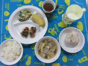 2月12日(木) 給食・おやつ献立 公開済み: 2026年2月12日更新: 2026年2月14日作成者: hayamanookaカテゴリー: 端山の丘こども園給食 <給食> 御飯 すまし汁(だいこん・油揚げ) 鶏の海苔焼き 小松菜のしらすサラダ(キャベツ) バナナ <おやつ> 牛乳 さけわかめおにぎり(わかめ・ごま) さくら・ゆり組は遠足の為、給食の提供はありません。 関連記事 10月9日 給食 あんかけうどん(ささみ) ベビーチーズ パイン缶 公開済み: 2021年10月9日更新: 2021年10月9日作成者: hayamanookaカテゴリー: 端山の丘こども園給食 4月15日給食 ごはん サーモン豆乳シチュー(カレー味) キャベツとささみのサラダ フルーツカクテル 公開済み: 2020年4月15日更新: 2020年4月15日作成者: hayamanookaカテゴリー: 端山の丘こども園給食 4月20日(木) 給食・おやつ献立 〈給食〉 ・ごはん ・クラムチャウダー(豆乳) ・さけのケチャップあえ ・キャベツとしらすのサラダ ・りんご 〈おやつ〉 ・牛乳 ・焼きビーフン 公開済み: 2023年4月20日更新: 2023年4月21日作成者: hayamanookaカテゴリー: 端山の丘こども園給食