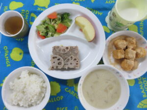 2月19日(木) 給食・おやつ献立 公開済み: 2026年2月19日更新: 2026年2月27日作成者: hayamanookaカテゴリー: 端山の丘こども園給食 <給食> 御飯 コーンスープ(だいこん・豆乳) れんこんバーグ 蒸し野菜のサラダ りんご <おやつ> 牛乳 高野豆腐のコロコロ揚げ 関連記事 8月27日(水) 給食・おやつ献立 <給食> 御飯 はるさめスープ(チンゲン菜) 厚揚げのケチャップ煮 おくらの梅和え オレンジ 今日の厚揚げのケチャップ煮に入っているたまねぎはきりん組さんが皮むきをしてくれました! <おやつ> 牛 […] 公開済み: 2025年8月27日更新: 2025年8月27日作成者: hayamanookaカテゴリー: 端山の丘こども園給食 6月30日(木) 給食・おやつ献立 ・ごはん ・はるさめスープ ・鶏肉の甘酢煮 ・きゅうりのゆかりあえ 〈おやつ〉 ・牛乳 ・豆腐ガトーショコラ 公開済み: 2022年6月30日更新: 2022年7月15日作成者: hayamanookaカテゴリー: 端山の丘こども園給食 4月4日(金) 給食・おやつ献立 <給食> 御飯 みそ汁 鶏のから揚げ(のり) ブロッコリーのおかか和え(にんじん) バナナ <おやつ> 牛乳 ホットケーキ 公開済み: 2025年4月4日更新: 2025年4月4日作成者: hayamanookaカテゴリー: 端山の丘こども園給食