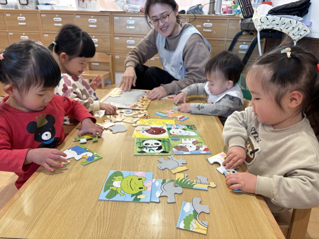 おままごとに積み木・線路などたくさんの玩具がある中で、最近のブームは【パズル☆】椅子に座ってお姉さんやお兄さんの真似っこをして、パズルのピースとにらめっこ!『できた~』の嬉しい声が聞こえてきます。