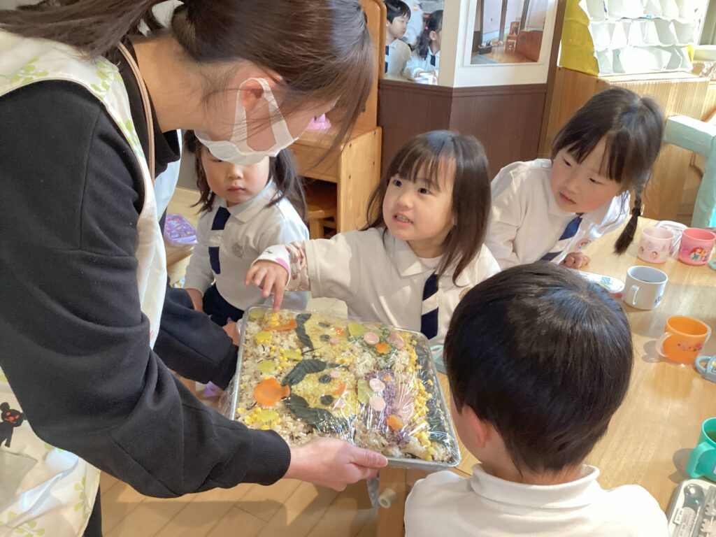 【うれしいひな祭り🎎】(たんぽぽ組:3歳児) 公開済み: 2026年3月2日更新: 2026年3月7日作成者: sakuranosatoカテゴリー: さくらの里保育園, さくらの里保育園ブログ 「あかりをつけましょ・ぼんぼりに~♪」子ども達の成長を願うひな祭り。お内裏様とお雛様は保育園にも飾ってあるけれど、なんと!給食にもお雛様たちが登場してくれました🌸