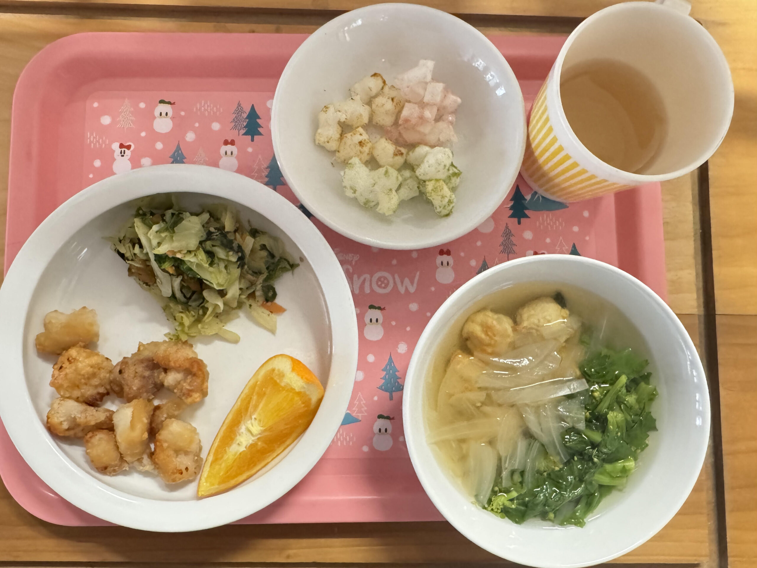 3月2日(月)の給食とおやつ 公開済み: 2026年3月3日更新: 2026年3月3日作成者: sakuranosatoカテゴリー: さくらの里保育園, さくらの里保育園園・給食だより 【給食】 ひな祭りちらし寿司 だんご汁 鶏肉の甘辛揚げ 菜の花のごま和え オレンジ 【おやつ】 ひなあられ