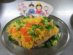3月3日(火) 給食・おやつ献立 公開済み: 2026年3月3日更新: 2026年3月7日作成者: hayamanookaカテゴリー: 端山の丘こども園給食 今日は、ひな祭りと3月生まれのお友達のお誕生日会でした! おめでとうございます! <給食> ひちもち風ごはん(さけごはん・わかめごはん・ごまごはんで3色のひしもちに見立てて盛り付けをしましたよ☆) すまし汁(たけのこ・わかめ) 鶏肉のマーマレード焼き フルーツカクテル(もも) <おやつ> カルピス(カルピスさんよりいただきました!) ひなまつりケーキ ひなあられ 関連記事 10月26日(水) 給食・おやつ献立 〈給食〉 ・さわらの焼きおろし煮 ・もやしのナムル ・焼きがんもどきのあんかけ ・ごはん ・みそ汁(白菜・さといも) 〈おやつ〉 ・牛乳 ・キャロットケーキ 公開済み: 2022年10月26日更新: 2022年11月7日作成者: hayamanookaカテゴリー: 端山の丘こども園給食 5月30日(木)給食・おやつ献立 <給食> 御飯 スープ(じゃがいも・ほうれん草) マーボー豆腐(たまねぎ) 切干大根のごまサラダ オレンジ <おやつ> 牛乳 ココア麩ラスク 公開済み: 2024年5月30日更新: 2024年6月1日作成者: hayamanookaカテゴリー: 端山の丘こども園給食 12月5日給食 ひじきチャーハン すまし汁(小松菜) パイン缶 公開済み: 2020年12月7日更新: 2020年12月7日作成者: hayamanookaカテゴリー: 端山の丘こども園給食